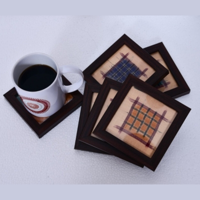 | Specification | Set of six wooden coasters featuring authentic Sambalpuri handwoven fabric beneath a protective glass top. Each piece showcases traditional Odia motifs like flowers, wheels, and conches. |