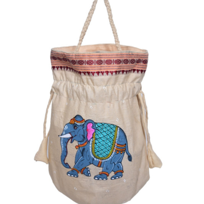 Set against a soft natural cream base, the potli is brought to life with calming blues, turquoise greens, and warm accent tones, creating a harmonious visual composition. In Pattachitra, the elephant motif is traditionally associated with strength, wisdom, stability, prosperity, and auspicious beginnings, making it a meaningful presence in ceremonial and everyday contexts alike.