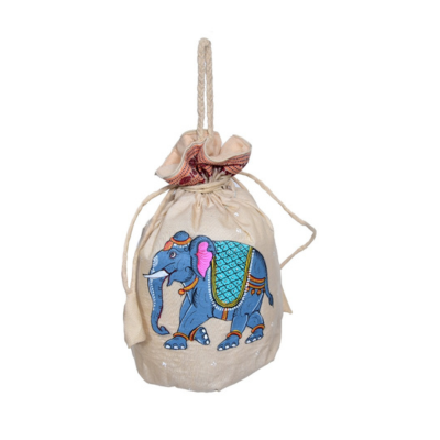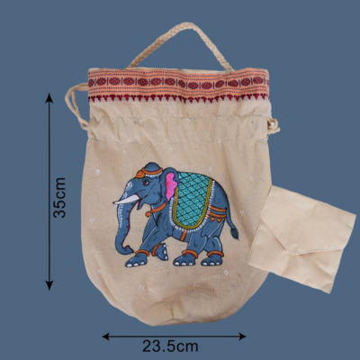 Specification This potli has the traditional temple and rudrakhsya motifs on the boarder with pattachitra painting of a elephant.. It comes with a coin pouch.