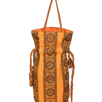 A graceful handcrafted potli made from authentic Sambalpuri Ikat fabric of Odisha, renowned for its intricate tie-and-dye artistry and enduring weaving tradition. Dressed in a warm mustard-ochre hue with finely detailed contrasting motifs, the design is highlighted by the iconic Konark Chakra pattern—drawn from the sacred wheel of the Konark Sun Temple, symbolising energy, rhythm, and timeless continuity.