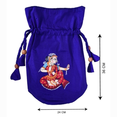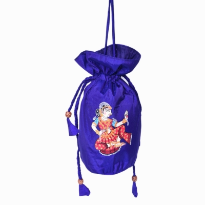 Elegant and expressive, the Neelambara Nartaki Potli captures the timeless grace of classical Indian dance through the intricate Pattachitra art of Odisha. Hand-painted on rich royal blue silk, the dancing woman reflects rhythm, devotion, and the celebratory spirit deeply rooted in Odisha’s cultural heritage.
