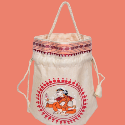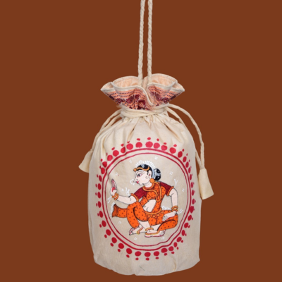 Rendered in soft natural tones with a striking depiction of the dancing deity at its heart, this potli embodies grace, balance, and sacred expression. Thoughtfully designed for festive occasions, rituals, cultural gatherings, and meaningful gifting, it is a piece that carries both beauty and symbolism.