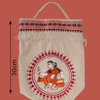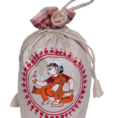 Inspired by the divine language of dance, the Nritya Devi Potli is a graceful celebration of movement, devotion, and living tradition. Crafted from traditional Odisha handloom cotton, it features exquisite hand-painted Pattachitra artwork, where every brushstroke reflects the rhythm of temple art and the timeless spirit of Odisha’s cultural heritage.