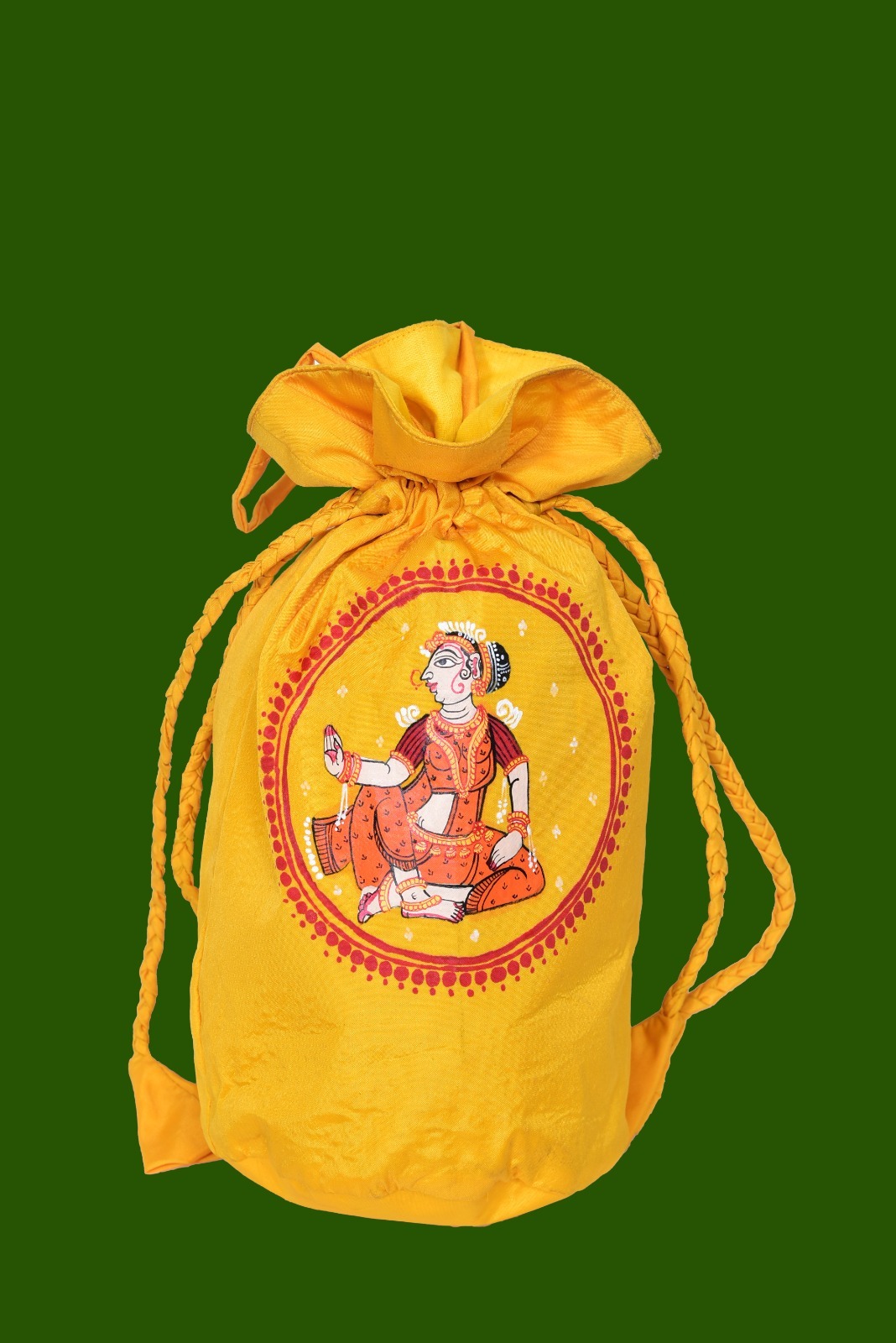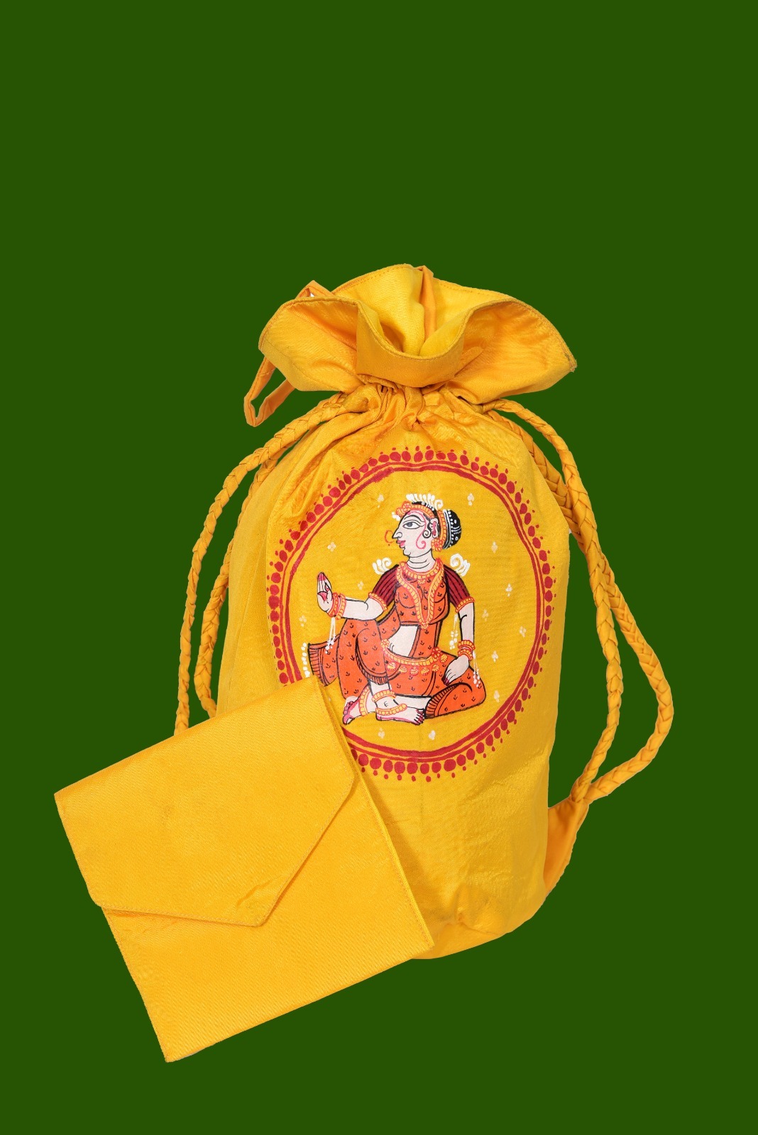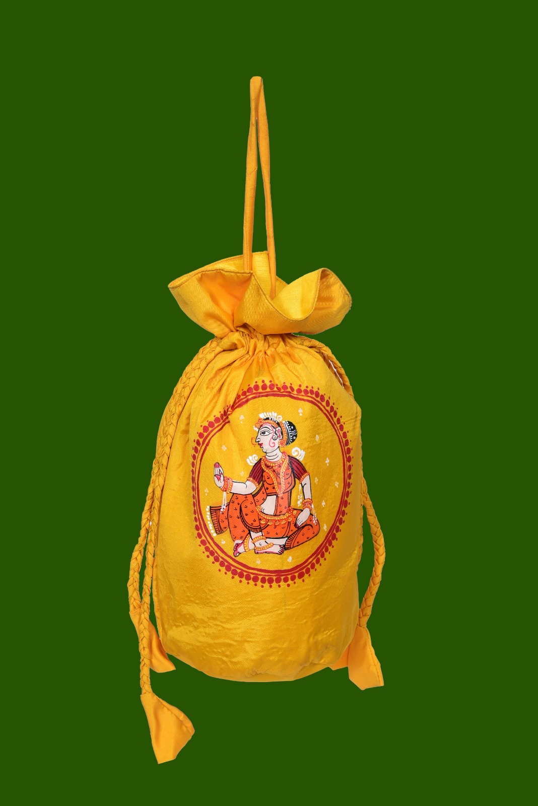+ Free ShippingElegant and timeless, Nritya Sundri is a luxury handcrafted potli designed to complement sarees and traditional ensembles. Crafted from rich Sambalpuri silk, this potli features exquisite hand-painted Pattachitra dancer motifs on both sides, celebrating the grace, rhythm, and cultural heritage of Odisha.