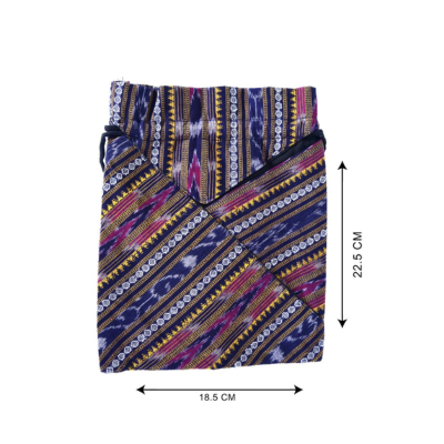 A beautifully handcrafted rectangular potli (22.5 cm length × 18.5 cm breadth) made from the exquisite Nuapatna single Ikat Bandha fabric of Odisha. Woven in pure cotton, the fabric features temple and Rudraksha (or Chakra) motifs, symbolizing divinity and spiritual balance. Its multicoloured weave and intricate craftsmanship reflect the mastery of Nuapatna’s traditional artisans. Designed with flaps on both sides, this potli blends heritage and utility — a stylish yet cultural accessory, perfect for gifting, festive occasions, or complementing ethnic ensembles with timeless grace.