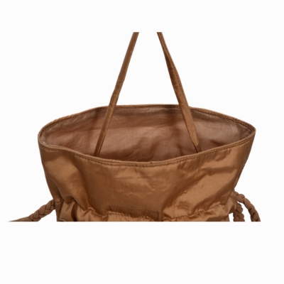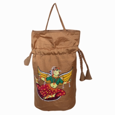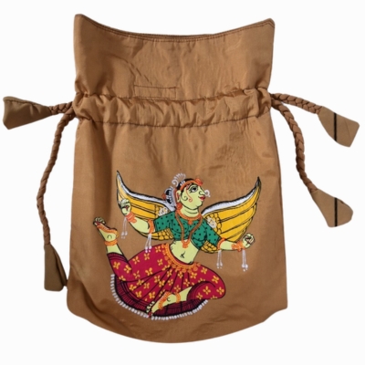 Handcrafted in luminous golden-brown silk, the potli is meticulously painted by skilled Pattachitra artisans, preserving the intricate detailing and cultural authenticity of this ancient art form. The rich silk texture, complemented by elegant braided drawstrings, makes it both functional and exquisite.